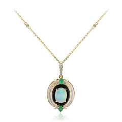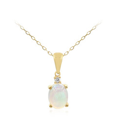 Indulge in the allure of this mesmerizing 1.57 ct AAA-Welo Opal necklace from Ethiopia, elegantly set in 10K yellow gold. The oval cabochon opal is a play-of-color wonder, accompanied by a vertical bar of sparkling SI2 (H) diamonds totaling 0.118 ct. The pendant, measuring 20x8 mm, dangles gracefully from a 45 cm gold chain. This piece's bewitching colors make it ideal for both daytime finesse and evening glamour, sure to be a conversation starter at any social gathering.
