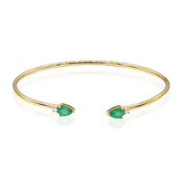 Discover elegance with this AAA Zambian emerald gold bangle. Crafted from 14K yellow gold, it features two stunning pear-shaped emeralds and brilliant-cut diamonds. Perfect for evening wear or stylish day looks, this bracelet adds a touch of sophistication to any outfit. Pair it with a chic black dress or casual jeans to make a statement.