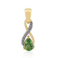 Discover the allure of this exquisite pendant, featuring a pear-shaped AAA Tsavorite of 0.366 carats from Kenya, cradled in 9K gold. The swirling gold design is enhanced with nine sparkling round-cut Zircon stones totaling 0.055 carats from Tanzania, adding an elegant contrast. The pendant weighs approximately 0.8 grams and measures 18x6 mm, making it a striking yet delicate addition to any outfit. Perfect for special occasions or as a standout piece for everyday elegance, this pendant is sure to captivate.