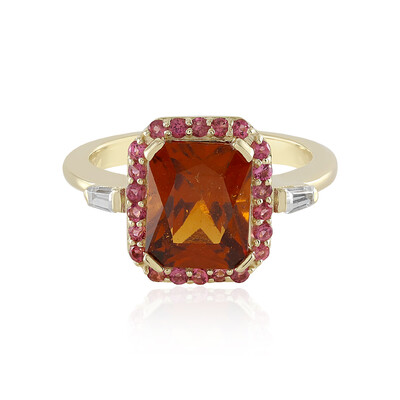 Make a bold statement with this striking 9K yellow gold ring featuring a luscious 3.45ct octagon radiant-cut Hessonite Garnet from India. Flanked by two sparkling Cambodian zircon and encircled by a halo of Madagascar rubellites, this piece exudes warmth and elegance. Whether attending a formal event or elevating everyday wear, this ring promises to draw admiration. Pair it with earth tones or contrasting cool blues for an impeccable style.