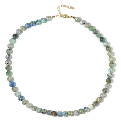 This stunning necklace features exquisite Namibian chrysocolla beads, each radiating unique hues of green and blue. Crafted with 925 sterling silver, the beads are elegantly gold-plated for a sophisticated finish. Weighing a total of 181.137 carats, this 45-50 cm piece adds a vibrant touch to any ensemble. Ideal for casual to formal settings, it pairs beautifully with earthy tones or simple white outfits for a chic look.