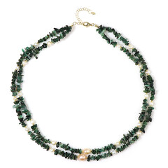 Discover the harmonious blend of oceanic hues and classic elegance with this exquisite necklace. Featuring vibrant Peruvian Chrysocolla beads interspersed with lustrous Chinese freshwater pearls, each piece is crafted to highlight the unique beauty and various sizes of the natural stones. Set in 1.4g of gold-plated 925 sterling silver, the necklace spans approximately 45-50 cm, perfectly draping around the neck for a statement of sophistication. This exceptional piece is versatile for daywear or a refined evening ensemble.