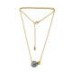 This delicately crafted necklace brings together the lush greens of Brazilian Fuchsite with the warm glow of Baltic Amber in an exquisite dance of color and grace. The 7.36 ct round Fuchsite cabochon, paired with the 0.36 ct round Amber, both set in golden-hued, 925 Sterling Silver, acts as the centerpiece of this piece. It hangs elegantly from a gold-plated chain, adjustable from 45 to 50 cm, ensuring a perfect fit for any neckline. Ideal for both casual and sophisticated attire, it adds a splash of earthy elegance to any outfit.