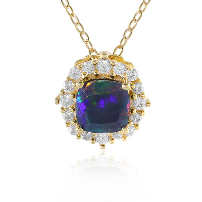 Discover the enchanting allure of the Mezezo Opal Gold-Plated Silver Necklace. At the heart of this piece is a captivating 0.846 ct antique cushion-cut Mezezo Opal from Ethiopia, framed by sparkling Cambodian zircons. The 925 sterling silver is gold-plated for an elegant finish. Perfect for special occasions, this necklace complements both evening gowns and chic casual wear, adding a touch of luxury to any outfit.