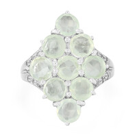Discover the serene beauty of this Australian Prehnite ring, featuring a constellation of nine gemstones totaling 3.69 carats, each graced with a round buff-top cut for added dimension. Encircling this pale green array are eight sparkling Brazilian white topazes that meticulously complement the centerpiece. Crafted in 925 sterling silver with a harmonious design spanning 24x20 mm, this graceful piece boasts a light-catching allure. Perfect for adding a touch of elegance to both daytime and evening wear, the ring promises to be a versatile addition to any jewelry collection.