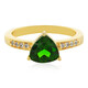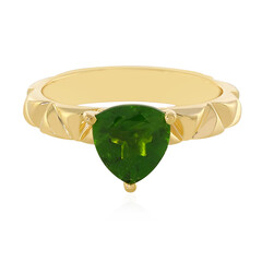 Discover the allure of this captivating gold-plated 925 Sterling Silver ring, graced with a 1.124 ct trilliant-cut Russian Diopside as its centerpiece, flanked by sparkling Cambodian Zircon accents totaling 0.115 ct. The band, approximately 2.45 g, epitomizes elegance with its rich gold hue. Ideal for adding a pop of vibrant green to your ensemble, this ring is a stunning choice for special occasions or everyday sophistication.