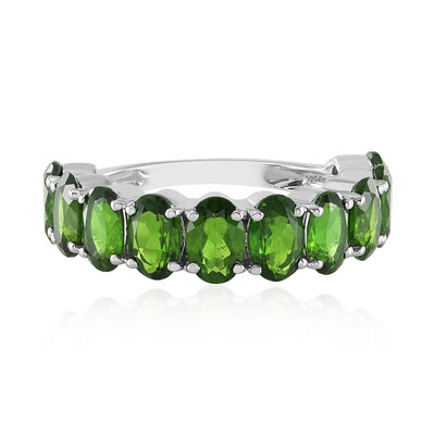 Discover the allure of the vivid green Russian Diopside with this exquisite ring. The ten oval-cut diopsides, totaling 3.8 carats, are elegantly set in platinum-plated 925 sterling silver, showcasing a spectacular array of lush hues. With an approximate silver weight of 2.62g, this ring makes both a luxurious and comfortable statement. Suitable for every occasion, it elevates casual attire and complements formal wear with its radiant charm.