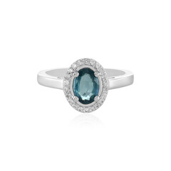 This captivating ring features a luxurious petrol-blue Indian Kyanite with an oval cut, weighing 0.616 ct. The center gem is encircled by a glittering halo of Cambodian Zircon stones, with a combined weight of 0.627 ct, creating a stunning contrast against the lustrous 925 sterling silver band. This piece radiates sophistication and is an ideal accessory for both daytime elegance and evening glamour. A total gem weight of 1.243 ct makes it a treasured addition to any collection. The intricate design ensures this ring will be a standout piece, perfect for pairing with a chic cocktail dress or a formal ensemble.