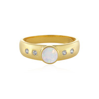 This radiant gold-plated 925 sterling silver ring features a captivating Ethiopian Welo Opal centerpiece, weighing 0.511 carats with a lustrous round cut. Encircled by four sparkling Cambodian Zircons totaling 0.199 carats, this piece showcases a total gem weight of 0.71 carats. The 21x19 mm dimensions ensure a significant but elegant presence, perfect for adding a touch of luxury to both day and night ensembles. Its warm gold tones complement the opal's play of color, making it a versatile addition to any jewelry collection.