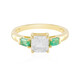 Discover the allure of this gold-plated sterling silver ring, featuring a dazzling 2.599 ct Cambodian zircon with a unique octagon Asscher cut at its center, flanked by two vivid Russian Emeralds totaling 0.509 ct in a harmonious octagon cut. With a combined gem weight of 3.108 ct, this piece is not just a ring but a statement of elegance. Its sophisticated contrast of clear zircon and lush green emeralds complements formal wear and adds a touch of opulence to everyday outfits.
